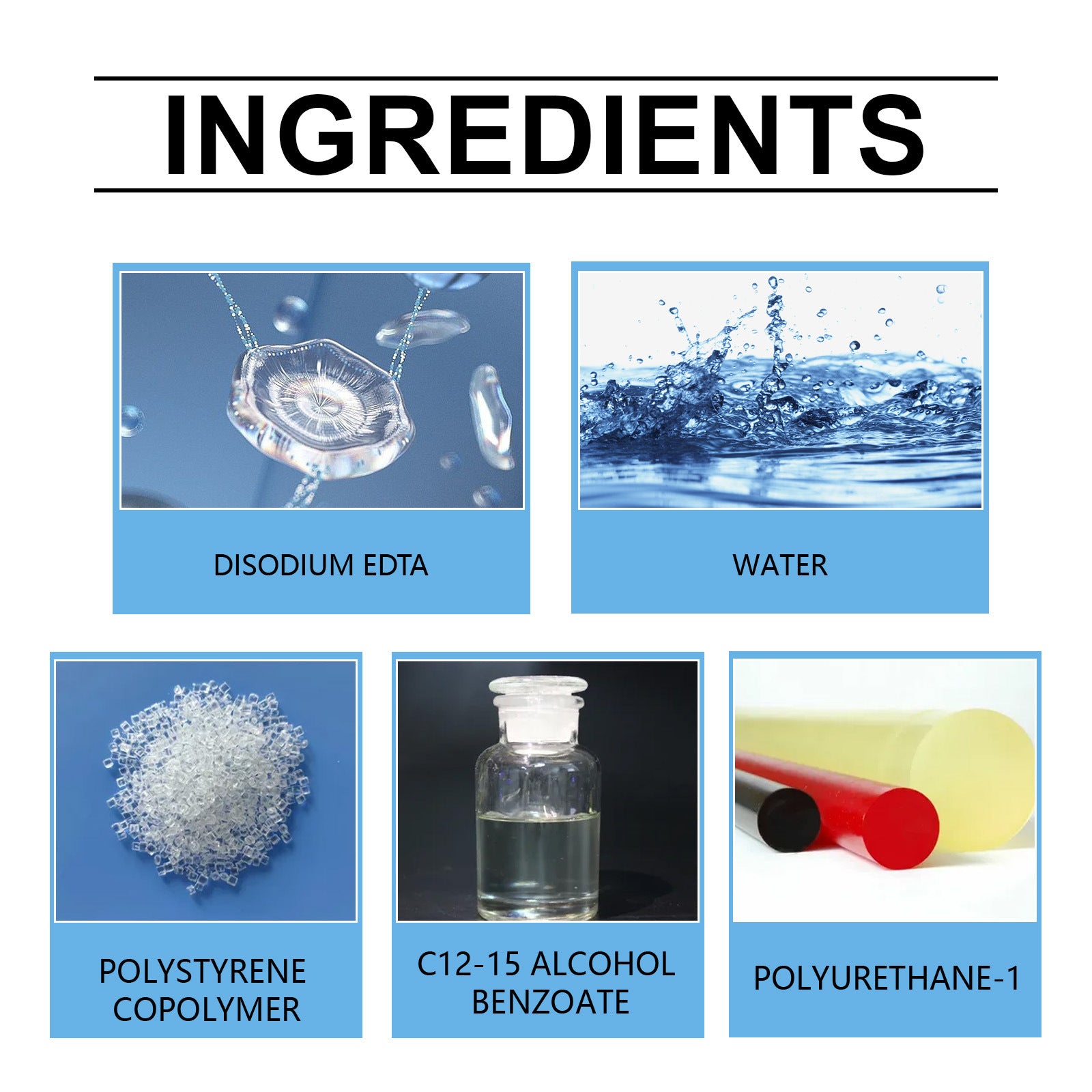 Product ingredients: water, disodium EDTA, polystyrene copolymer,