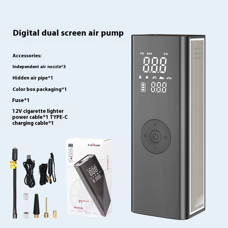 Inflator pump * 1 Independent air nozzle * 3 Hidden trachea * 1 Color box packaging * 1 Fuse * 1 12V cigarette lighter power cord * 1 TYPE-C charging cable * 1